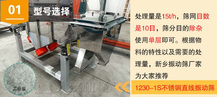 下面小編從型號選擇、方案設計、篩機材質這三個方面給大家介紹一下篩分工業鹽用直線振動篩好在哪里?希望這個簡單的技術分享便于各位需要工業鹽篩分用戶參考: