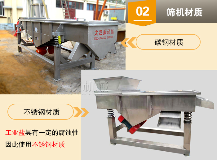 【篩機材質】——常用的直線振動篩有不銹鋼和碳鋼兩種材質,因為工業鹽具有一定的腐蝕性,因此使用不銹鋼材質,使用時間更長,對物料也具有保護作用。