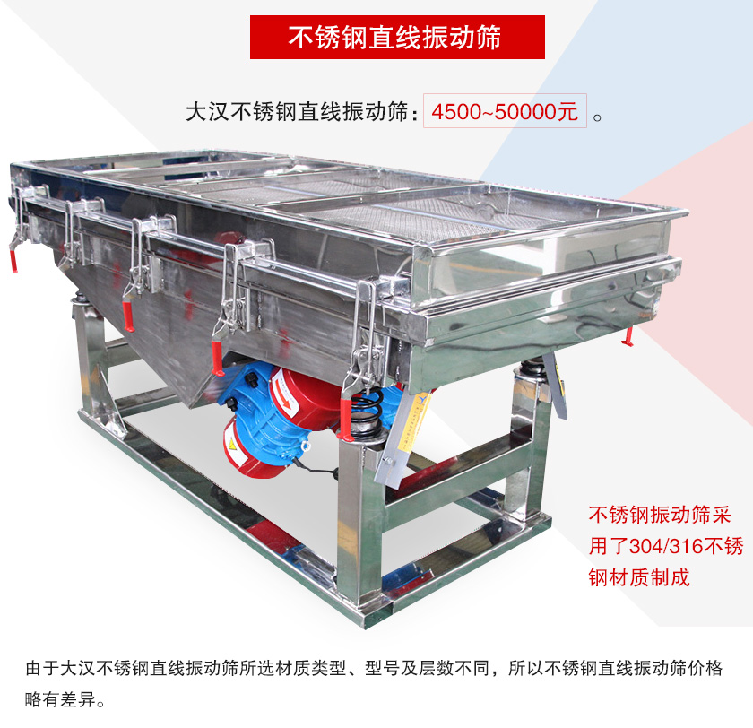 不銹鋼振動篩采用了304/316不銹鋼材質(zhì)制成的,設(shè)備經(jīng)由拋光處理,可以用于食品、醫(yī)藥等對衛(wèi)生要求較為嚴格的行業(yè),那么不銹鋼直線振動篩多少錢一臺呢?大漢小編這就來為您進行介紹。